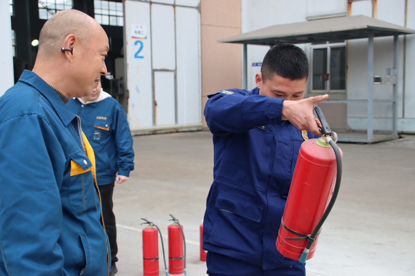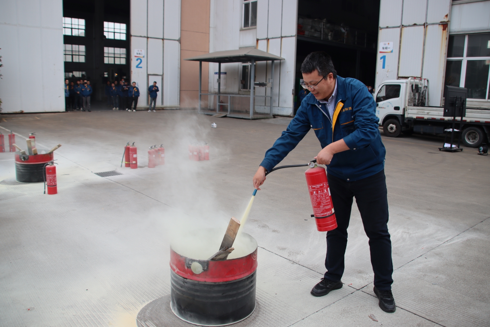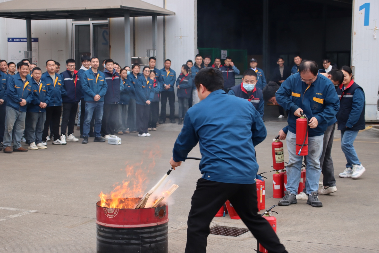 在林队长的专业指导下,员工进行灭火器操作实践。